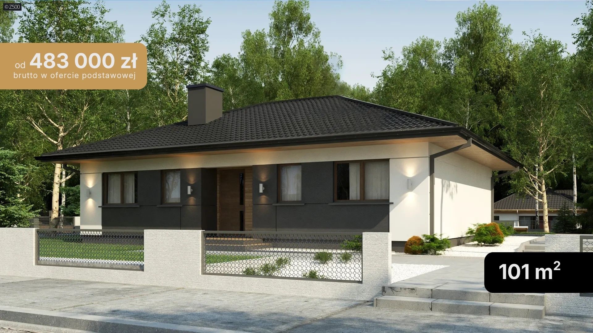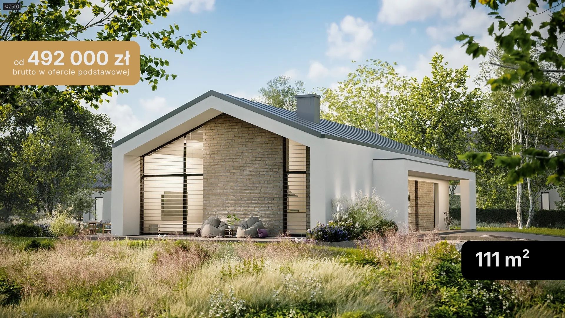 Z349 to dom parterowy na planie prostokąta z dwuspadowym dachem, wykończony tynkiem z grafitowymi detalami i drewnianymi panelami.