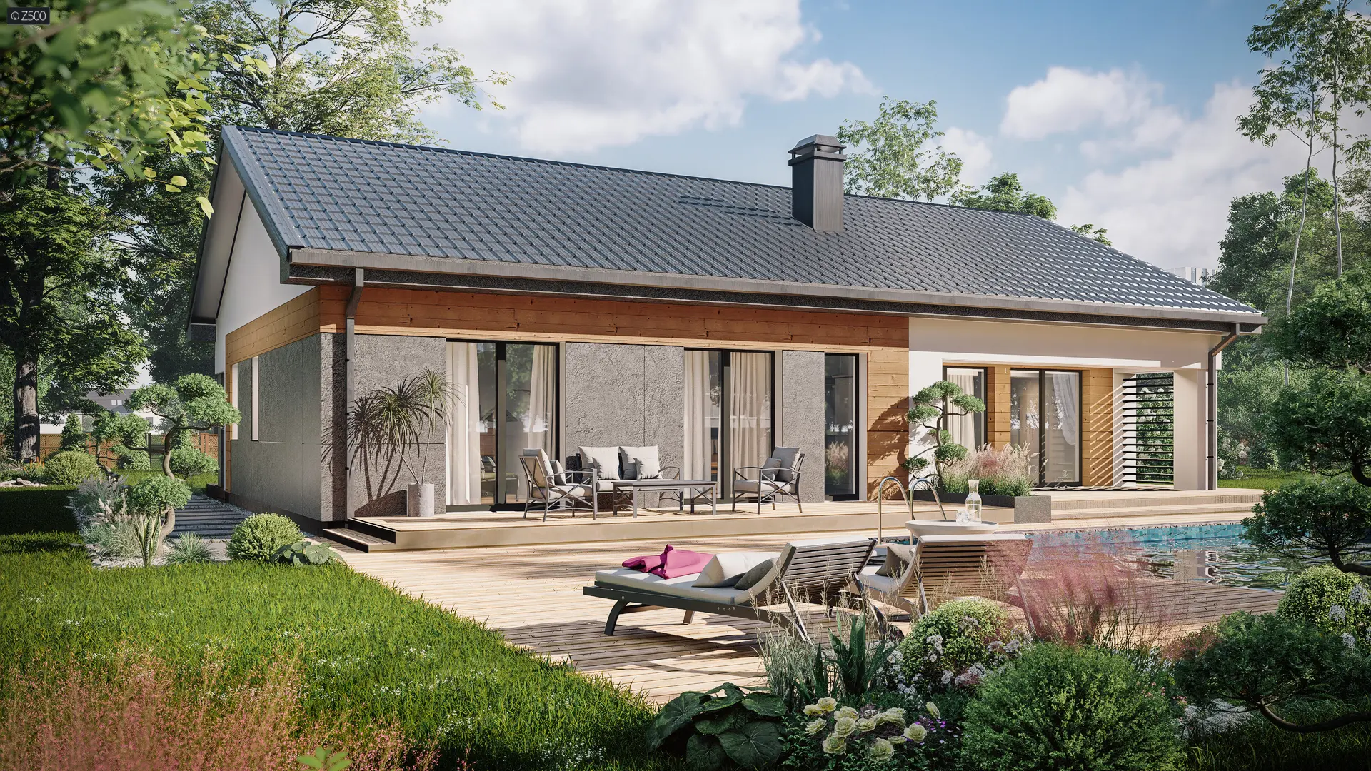 Z176 to funkcjonalny dom parterowy z dachem kopertowym, wykończony tynkiem z subtelnymi elementami drewnianej okładziny elewacyjnej.