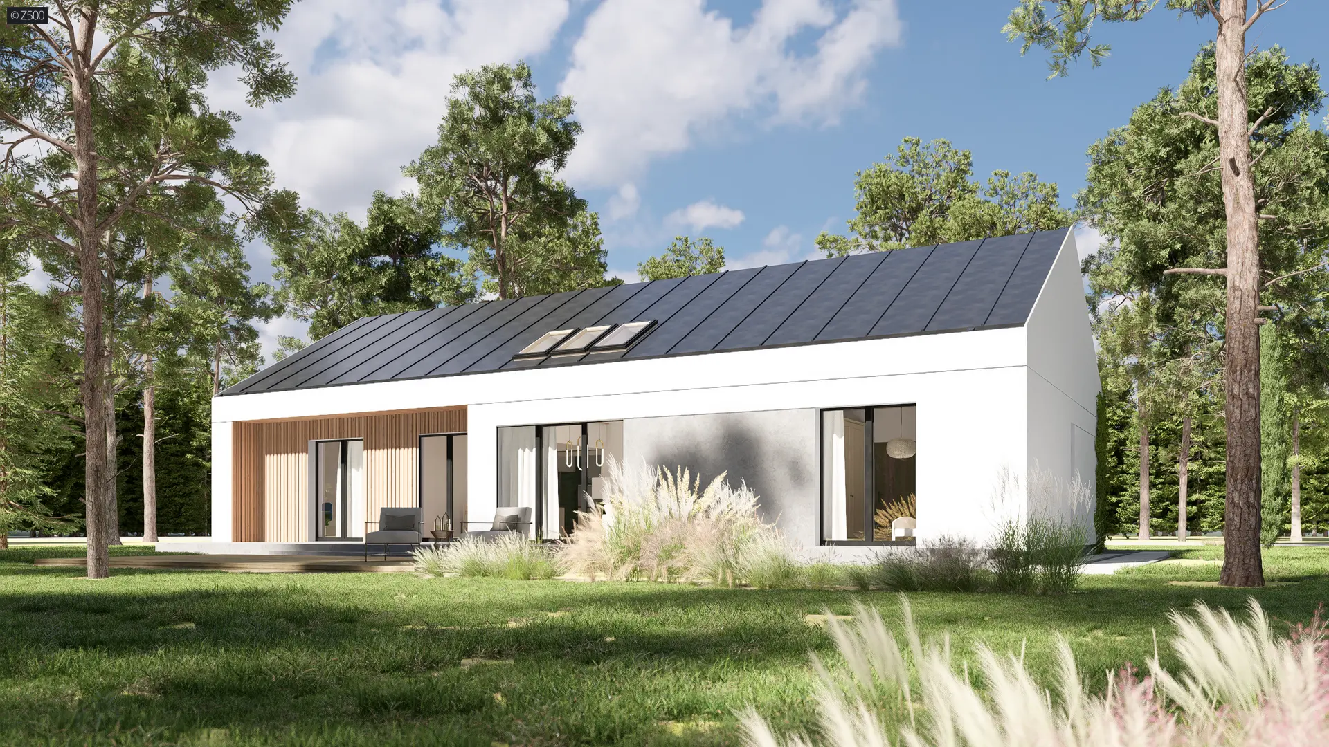 Z349 to dom parterowy na planie prostokąta z dwuspadowym dachem, wykończony tynkiem z grafitowymi detalami i drewnianymi panelami.