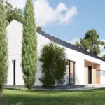 Projekt wyróżnia się minimalistyczną, a zarazem efektowną elewacją łączącą naturalne drewno z surowym tynkiem. Prosta bryła z dachem dwuspadowym bez okapów podkreśla nowoczesny charakter inwestycji i wpisuje się w aktualne trendy „nowoczesnej stodoły”. Brak barier w postaci schodów oraz przemyślana komunikacja sprawiają, że Z577 jest idealnym rozwiązaniem dla osób szukających wygody i ponadczasowego designu na jednym poziomie.