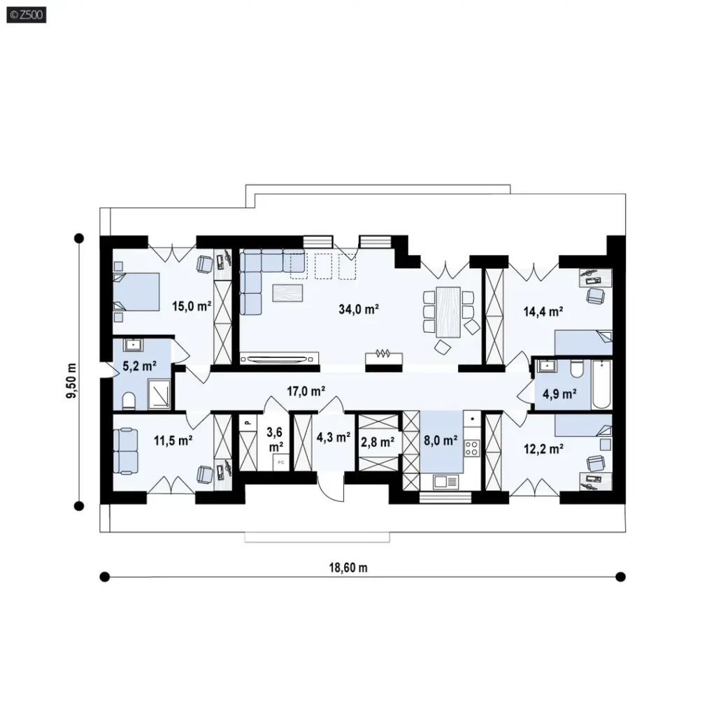 - szer. elewacji: 18.60 m